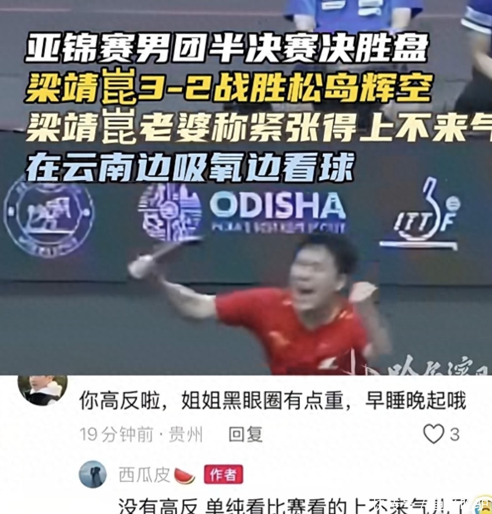 很快梁靖崑妻子“吸氧看球”的照片也被刷屏,奚美丽以一张配文“差点死了”的吸氧看球的照片,照片中她半躺在床上,插着氧气管,黑眼圈明显。她当时IP显示云南,有网友便及时送上“温馨提示”:“身处高原环境,情绪不宜太过激动。”但奚美丽明确回应网友“没有高反,单纯是看比赛看得上不来气儿”。